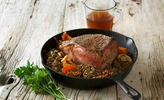 Limpiar la carne y sellarla en una cazuela con aceite y manteca hasta dorar la superficie. Retirar y salar a gusto. Machacar los granos de pimienta e insertarlos en la superficie de la carne. Reservar. En la misma cazuela rehogar las cebollas, las cebollas de verdeo y los dientes de ajo finamente picados, y salar para que suden. Agregar las zanahorias y las papas cortadas en trozos no muy grandes. Añadir también las lentejas previamente remojadas de un día para el otro. Acomodar la carne de Roast beef dentro de la cazuela y verter el vino blanco. Dejar que tome punto de hervor e incorporar el puré de tomates. Agregar caldo de verduras hasta cubrir las lentejas y cocinar (ir sumando más caldo a medida que la preparación lo requiera). A mitad de cocción dar vuelta la carne para cocinarla de manera pareja. Verificar la sal y condimentar la cazuela con ají molido, pimentón y cilantro picado. También se puede agregar semillas de eneldo. Servir caliente y acompañar con pan casero.